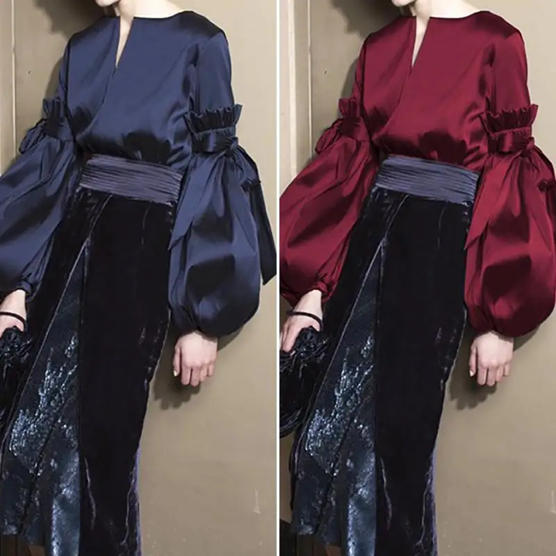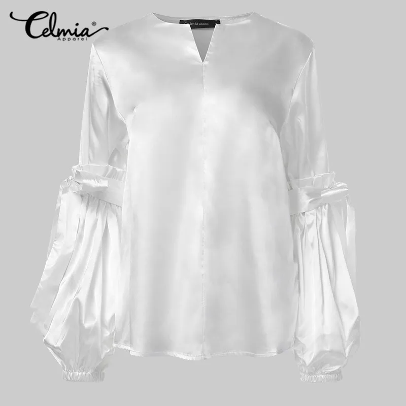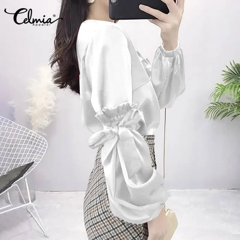 Promo Celmia Fashion V Neck Long Lantern Sleeve Blouse Elegant Office OL Women Soild Bow Bandage Shirt Top Casual Plus Size Blusas 7